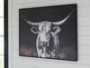 Add homespun charm to modern farmhouse and casual spaces. A longhorn cow takes center stage in this wall art, its white coat contrasting beautifully against the dark background tones. A sleek black frame completes the look.