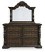 Details B947B2: Includes upholstered panel headboard, upholstered panel footboard and panel rails, Made with hardwood solids, oak and ash swirl veneers, MDF substrates and cast resin components, Dark brown finish, Polyester upholstery with button tufting, Foundation/box spring required, sold separately, Mattress available, sold separately, Assembly required, B947B1: Includes dresser and mirror, Made with hardwood solids, oak and ash swirl veneers, MDF substrates and cast resin components, Dark brown finish, 6 smooth-gliding drawers with dovetail construction (top drawer felt lined), Drawer pulls with antiqued goldtone finish, Mirror attaches to back of dresser,