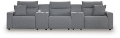 Details Includes 5 modular pieces: left-arm facing power recliner, armless chair, 2 consoles, and right-arm facing power recliner, "Left-arm" and "right-arm" describe the position of the arm when you face the piece, Versatile modular pieces fit together in a variety of configurations, One-touch power control with adjustable positions, Easy View™ adjustable headrest and zero-draw USB port, Zero-draw technology only consumes power when the USB receptacle is in use, Corner-blocked frame with metal reinforced seat, Attached back and seat cushions; high-quality foam cushions wrapped in poly fiber, Polyester upholstery; Next-Gen Nuvella™ is a family-friendly fabric that is soft, easy to clean, stain-resistant and durable, Clean fabric with mild soap and water, let air dry; for stubborn stains, use a solution of 4 oz. bleach to 28 oz. water, Throw pillows with easy-to-remove zippered covers for machine washing; pillows with soft polyfill, Console with plexiglass top and 2 cup holders, Zero wall recliner design requires minimal space between wall and chair back, Power cord included; UL Listed