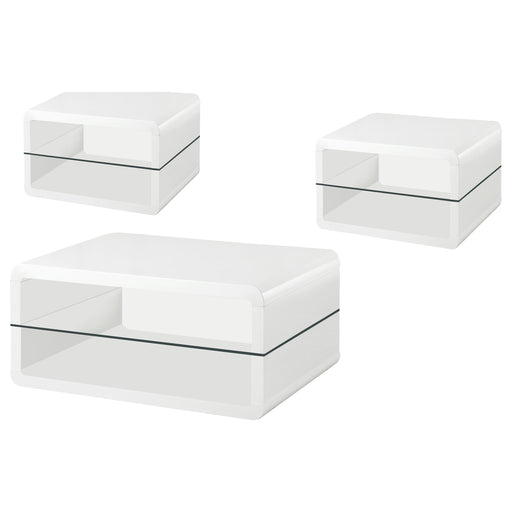 CoasterThis ultra-modern coffee table set pairs sleek white high-gloss finishes with clear tempered glass shelves for a contemporary aesthetic. Crafted fr...