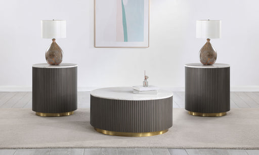 CoasterThis elegant coffee table set features a modern round coffee table and end table with a genuine white marble tops. The engineered wood frame in a c...