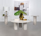 This coffee table set, featuring a coffee table and end table, showcases genuine white marble surfaces and cylindrical pedestal bases. The fluted and grid-textured design adds a refined architectural touch, blending classic elegance with modern minimalism. Perfect for creating a cohesive look in your living space, these tables are crafted for durability and timeless appeal. Ideal as functional and decorative pieces, this occasional table set brings sophistication to any contemporary or upscale interior.