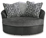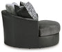 Appeal to your eye for ultra-contemporary design with this oversized swivel chair. Chic and sleek in dark neutrals, it pairs cozy fabric with faux leather for invitingly cool character. And with its robust size offering extra seating space, you can chill out in comfort and style.