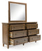 Details B787B5: Includes upholstered headboard, panel rails and bench footboard with slats, Made with hardwood solids, veneers and MDF substrates, Brown finish, Polyester upholstery, Nailhead trim, Turned feet, Foundation/box spring required, sold separately , Mattress available, sold separately, Assembly required, B787B1: Includes dresser and mirror, Made with hardwood solids, veneers and MDF substrates, Brown finish, Oil-rubbed bronze-tone knobs, 6 drawers with fully finished interior, dovetail construction and heavy duty ball-bearing side glides (top drawers felt lined), Turned feet, Mirror attaches to back of dresser,