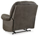 Details One-pull reclining motion, Steel to the floor construction; steel seat box; steel floor rails, Heavy gauge sinuous springs, Reinforced floor glides, Attached cushions, High-density foam cushions wrapped in poly fiber, Faux leather upholstery, Zero wall recliner design requires minimal space between wall and chair back, 47" back height, Reclining mechanism rated for 400 lbs.