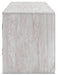 This TV stand with electric fireplace embraces a classically charming aesthetic and repurposes it for modern living. Its whitewash replicated paint appeals to your love of vintage character, while the chic chevron pattern is effortlessly on trend. Media accessories stay tucked away in style thanks to hidden storage behind the doors. And for added ambiance, the electric fireplace brings a cozy-cool vibe to your living room. With the touch of a button, activate the LED-lit flame and adjust the temperature or the flame brightness. The flame effect includes multiple color options and a realistic-looking faux birch log set.