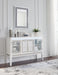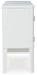 | Details | Made with solid wood components, MDF substrate and decorative PVC laminate, Bright white lacquer finish, 2 felt-lined drawers with fully finished interior, dovetail construction and ball-bearing side glides, 2 glass-front cabinets, each with adjustable shelf, Brushed champagne metal pulls, Rhinestone and textured PVC accents, LED accent lighting, Power cord included; UL Listed, Assembly required | |