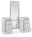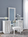 | Details | Includes vanity and mirror, Made with solid wood components, MDF substrate and decorative PVC laminate, Bright white lacquer finish, Vertical metal drawer pulls, Built-in LED lighting with 3-way dimmer switch, 3 drawers with fully finished interiors, English dovetail construction and heavy-duty ball-bearing side glides, Drawers with rhinestone frames; textured laminate drawer fronts, 110V power supply with USB-A and USB-C charging ports, Power cord included; UL Listed, Mirror with rhinestone frame; attaches to back of dresser | |