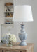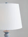 Details Made of terra cotta and wood with empire hardback fabric shade, Antiqued blue finish, 3-way switch, 1 E26 socket, type A bulb (not included); 150 watts max or LED equivalent; UL Listed, Due to the finishing process, some variations may occur, Assembly required