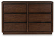 Casual contemporary styling with a decidedly modern vibe. This dresser is warm and inviting with a rich dark brown finish, adorning your restful retreat with on-trend elegance. Full-length metal pulls in a matte black finish add a subtly cool touch to spacious storage drawers. What a simply stunning way to achieve the bedroom of your dreams.