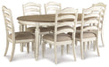 | Details | D743-45: Made of veneers, wood and engineered wood with some cast resin components, Antiqued two-tone finish, Separate extension leaf, Table extends by pulling both ends and dropping in leaf, Seats up to 8, Assembly required, D743-02: Made with wood and engineered wood, Distressed, chipped white finish, Stylized ribbon back design, Polyester upholstery over foam cushioned seat, Assembly required, | |