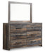 Details Made of engineered wood (MDF/particleboard) and decorative laminate, Brown rustic finish with burnt orange and teal accents in a replicated wood grain with authentic touch, 6 smooth-gliding drawers, Drawers lined with faux linen laminate, Dark-tone industrial hardware, Mirror attaches to back of dresser, Assembly required, Includes tipover restraint device