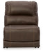 Details Includes left-arm facing power recliner, 4 power armless recliners, 2 consoles with storage, wedge and right-arm facing power recliner, "Left-arm" and "right-arm" describe the position of the arm when you face the piece, One-touch power control with adjustable positions, Easy View™ adjustable headrest and zero-draw USB plug-in, Zero-draw technology only consumes power when the USB receptacle is in use, Zero-gravity mechanism allows optimum reclining comfort with infinite reclining positions at the touch of a button, Corner-blocked frame with metal reinforced seat; attached cushions; high-quality foam cushions wrapped in poly fiber, 100% top grain leather covers inside areas such as the back, seat and arm cushions; skillfully matched faux leather covers the remaining areas, Due to its natural origin, real leather can show individual characteristics such as healed scars, growth marks, grain variation and shade variation, Natural variations make each hide unique and do not detract from the wearing qualities of leather, Console with 2 cup holders and hidden storage, Extended ottoman for enhanced comfort, Zero wall design requires minimal space between wall and chair back, Power cord included; UL Listed