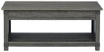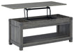 Open the door to modern farmhouse style with this lift-top coffee table. The beautiful woodgrain look and classic crossbuck metal accents are a cool touch, while the lower shelf provides surface space for fashionable home accessories. Sporting a gray replicated wood grain effect, its handy spring-loaded mechanism brings the tabletop closer to you. This versatile table makes it easier than ever to eat, work or play from the comfort of your sofa.