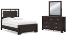 Details B441B4: Includes panel headboard, footboard, rails and slats, Made with hardwood solids, engineered wood veneer and MDF substrates, Dark brown finish, Floating panel headboard, Picture frame footboard, Foundation/box spring required, sold separately , Mattress available, sold separately, Assembly required, B441B1: Includes dresser and mirror, Made with hardwood solids, engineered wood veneer and MDF substrates, Dark brown finish, Metal bar pulls with bright nickel-tone finish, 7 smooth-gliding drawers with dovetail construction and metal center guides, Drawer interiors are lined with a wood grain laminate for a clean, finished look, Top moulding on dresser, Mirror attaches to back of dresser,