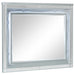 Transform a bedroom into a stylish sanctuary. This stunning, five-piece bedroom set is a truly exquisite choice with its elegant fretwork and dramatic decorative accents. The metallic leatherette headboard flaunts crystal button tufting for a touch of bling. The headboard and mirror are traced with blue LED light for soft ambiance. The nightstand, chest, and dresser feature decorative drawer fronts and provide plenty of storage space for a neat and organized personal space.