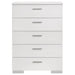 Bold and modern, this five-piece bedroom set is ideal for a contemporary home. It comes complete with a bed, nightstand, chest, dresser, and mirror to effortlessly complete your space. Each piece is coated in white polyurethane with a beautiful, high-gloss finish. Shining chrome accents add a dazzling hint of polish. With a sleek design and quality craftsmanship, this set is a stylish choice.