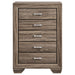 Keep your bedroom looking neat and stylish with this transitional five-piece set. It comes complete with a bed, dresser, nightstand, mirror, and chest, all beautifully crafted with an elegant design. Gorgeous, engineered wood construction is enhanced by natural oak wood grain and a beautiful patina in a greyish brown tone. Black recessed grooves create a stunning contrast that really stands out. Each case piece features a chic picture framed front and ample storage space to keep you organized with ease.