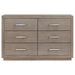 Enjoy the roomy storage and understated character of a modern six-drawer dresser. It's a fresh, understated design that showcases a wide top and recessed base that pair to deliver a timeless look. The dresser shows off wood grain details in a neutral barley brown finish, delivering stylish flair that complements in any setting. Each drawer is equally sized for easy storage and organization. Chrome finish bar pulls add a touch of contrast and textural appeal.