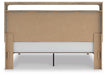 The natural wood tones and clean lines of this king upholstered platform bed echo your easygoing style sensibilities. With a warm finish and replicated oak grain, its carefree character lightens up your bedroom. Curved inner corner details soften the look, while contrasting brown fabric modernizes the feel. And for added function, warm LED lighting adds serene ambiance at the touch of a button.