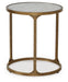 This end table blends a traditional feel with contemporary design cues. Antiqued gold texturing on the frame has the look of timeworn, hand-forged metal. A tempered glass top with a faux marble finish provides a refined contrast. Chic when hosting decor, a lamp or holding entertainment essentials, this table rounds out your living room with transitional flair.