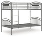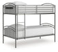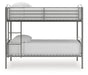 | Details | Made with welded tubular steel frame, Durable steel gray powder coat finish, Tubular steel slats for mattress support, Top bunk with protective side rails, Sturdy ladder leads to top bunk, Ladder with left or right side convertibility, Bunk can convert into two twin beds, Bed does not require additional foundation/box spring, Mattress available, sold separately, The Consumer Product Safety Commission states top bunks not be used for children under 6 years of age, Assembly required | |