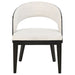 • Cream upholstered arm chairs offer barrel-back support and sculptural comfort