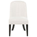 • Dining side chair wrapped in cream fabric with subtle channel tufting along the back