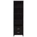Elevate your entertainment area with this versatile media tower, designed with sleek lines and a cappuccino finish for contemporary appeal. Four open shelves provide ample space to display books, decor, or media devices, while adjustable shelving adds flexibility for customized storage. Two spacious drawers at the base keep accessories neatly tucked away, complemented by brushed silver hardware for a modern touch. Supported by tapered legs, this tower combines practical function with a stylish silhouette to complete your living space.