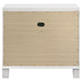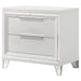 Complete your bedroom ensemble with this elegant 2-drawer nightstand, designed with a modern Italian aesthetic. The white finish, accented with mirror framing and polished chrome metal hardware, creates a striking look. Featuring picture framed recessed panels with an embossed herringbone graphic pattern, this nightstand offers both style and functionality. The top drawer includes cord management access, making it perfect for your rechargeable devices. Crafted from rubberwood, MDF, and mirror, this nightstand is a luxurious addition to any bedroom.