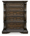 | Details | Made with hardwood solids, oak and ash swirl veneers, MDF substrates and cast resin components, Dark brown finish, 5 smooth-gliding drawers with dovetail construction (top drawer felt lined), Drawer pulls with antiqued goldtone finish | |