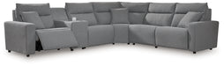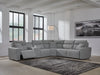Details Includes 6 modular pieces: left-arm facing power recliner, 2 armless chairs, console, wedge and right-arm facing power recliner, "Left-arm" and "right-arm" describe the position of the arm when you face the piece, Versatile modular pieces fit together in a variety of configurations, One-touch power control with adjustable positions, Easy View™ adjustable headrest and zero-draw USB port, Zero-draw technology only consumes power when the USB receptacle is in use, Corner-blocked frame with metal reinforced seat, Attached back and seat cushions; high-quality foam cushions wrapped in poly fiber, Polyester upholstery; Next-Gen Nuvella™ is a family-friendly fabric that is soft, easy to clean, stain-resistant and durable, Clean fabric with mild soap and water, let air dry; for stubborn stains, use a solution of 4 oz. bleach to 28 oz. water, Throw pillows with easy-to-remove zippered covers for machine washing; pillows with soft polyfill, Console with plexiglass top and 2 cup holders, Zero wall recliner design requires minimal space between wall and chair back, Power cord included; UL Listed