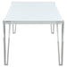 Clean lines and sleek materials give this dining table a distinctly modern edge. The white frosted tempered glass top offers a bright, airy look, while the polished stainless steel frame delivers durability and shine. Designed with geometric, hairpin-inspired legs, this rectangular dining table comfortably seats six and suits both casual and formal dining spaces with effortless style.