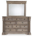 | Details | B916B2: Includes panel headboard, footboard with slats and rails, Made with hardwood solids, oak and ash veneer, cast resin components and engineered wood substrates, Tops with inlaid ash veneer border, Light warm grayish brown glazed wood finish, Breakfront pilasters, Inset picture frame panels, Headboard features light bridge with 2 overhead LED lights, Foundation/box spring required, sold separately , Mattress available, sold separately, Assembly required, B916B1: Includes dresser and mirror, Made with hardwood solids, oak and ash veneer, cast resin components and engineered wood substrates, Tops with inlaid ash veneer border, Light warm grayish brown glazed wood finish, Round metal knobs with satin nickel-tone finish, 10 drawers with fully finished interior, dovetail construction and ball-bearing side glides, Drawers with inset framed fronts, Dresser with breakfront pilasters, Mirror frame features light bridge with 2 mini LED lights, Mirror attaches to back of dresser, B916-46: Made with hardwood solids, oak and ash veneer, cast resin components and engineered wood substrates, Top with inlaid ash veneer border, Light warm grayish brown glazed wood finish, Round metal knobs with satin nickel-tone finish, 5 drawers with fully finished interior, dovetail construction and ball-bearing side glides, Drawers with inset framed fronts, Breakfront pilasters, B916-93: Made with hardwood solids, oak and ash veneer, cast resin components and engineered wood substrates, Top with inlaid ash veneer border, Light warm grayish brown glazed wood finish, Round metal knobs with satin nickel-tone finish, 3 drawers with fully finished interior, dovetail construction and ball-bearing side glides, Drawers with inset framed fronts, Breakfront pilasters, 110V power supply with dual USB charging ports, Power cord included; UL Listed, | |