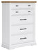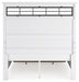 Details B844B2: Includes panel headboard, storage footboard, rails and roll slats, Footboard made with hardwood solids, MDF substrates and butcher block oak veneer, Headboard and rails made with hardwood solids and MDF substrates, White finish, Headboard with inset black metal barn sash, 2 drawers in footboard with fully finished interior, dovetail construction and ball-bearing side glides, Pulls with matte black finish, Bed does not require a foundation/box spring, Mattress available, sold separately, Assembly required, B844B1: Includes dresser and mirror, Made with hardwood solids, MDF substrates and butcher block oak veneer, Dresser with 2-tone finish (white finish; butcher block oak veneer with natural finish), Pulls with matte black finish, 10 spacious drawers with fully finished interiors (top drawers felt lined), dovetail construction and ball-bearing side glides , Drawers with inset picture fronts, Mirror attaches to back of dresser, B844-46: Made with hardwood solids, MDF substrates and butcher block oak veneer, 2-tone finish (white finish; butcher block oak veneer with natural finish), Pulls with matte black finish, 5 spacious drawers with fully finished interiors (top drawers felt lined), dovetail construction and ball-bearing side glides, Drawers with inset picture frame fronts, B844-93: Made with hardwood solids, MDF substrates and butcher block oak veneer, 2-tone finish (white finish; butcher block oak veneer with natural finish), Pulls with matte black finish, 3 spacious drawers with fully finished interiors (top drawers felt lined), dovetail construction and ball-bearing side glides, 110V power supply with dual USB charging ports, Power cord included; UL Listed, Drawers with inset picture frame fronts,