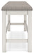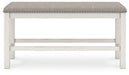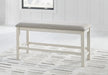 This counter height dining bench is sure to impress come mealtime. With its white finish and light gray upholstery, farmhouse-style seating has never been so fashionable. All that’s missing is you and your family.