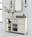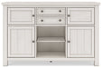 | Details | Made with rubberwood solids, ash veneer and MDF substrates, Antiqued white finish with wood grain texture, 4 cabinets; lower cabinets each have single adjustable shelf, 2 smooth-gliding drawers, Satin nickel-tone hardware, Top surface and cabinet doors with planked effect | |