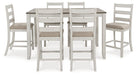 Details Includes counter height dining table and 6 counter height bar stools, Table made with hardwood solids, acacia veneer and MDF substrate, Stools made with solid wood frames, Grayish white finish with rub through effect, Table top with brown wood-tone finish, Polyester upholstery, Foam cushioned seats, Assembly required