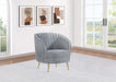 Bring mid-century charm and modern glamour to your space with this sculptural accent chair. Wrapped in soft grey velvet, it features a smooth barrel silhouette with vertical channel tufting that enhances its tailored appeal. Plush cushioning offers exceptional comfort, while gold stainless steel tapered legs provide a sleek, elevated finish. Built with a durable solid wood frame, this chair serves as a refined focal point in living rooms, bedrooms, or stylish lounge settings.