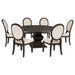 A graceful blend of refinement and comfort, this dining set brings timeless elegance to the heart of your home. The round dining table rests on a sculpted pedestal base, offering a striking silhouette in a rich dark cocoa finish. Matching oval back chairs provide soft cream upholstery with welt-trimmed details, combining plush seating with classical charm. Crafted from rubberwood, engineered wood, and veneer, this set is built for enduring strength and everyday beauty.