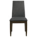 Bring a set of these beautiful contemporary side chairs to your dining table for a sophisticated touch. Designed with elegantly sloped backrests, each dining chair offers an inviting, slender silhouette for restful dining experiences. Across their frames, a dark walnut finish brings a depth of color and richness. Tapered square legs carry the modern touches. Lastly, soft grey fabric padding across the seat and contoured backrest create a comfy resting place.