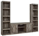 | Details | Includes TV stand and 2 piers, Made with engineered wood (MDF/particleboard) and decorative laminate, Gray planked replicated oak grain with authentic touch, TV stand has 2 storage cabinets and 1 open display space (with removable/adjustable shelf), Each pier has 4 shelves (3 adjustable), Round knobs and hooded pulls in dark bronze-tone finish, Cutouts for wire management and ventilation, Compatible with W100-02 and W100-101 LED fireplace inserts (sold separately), Assembly required | |